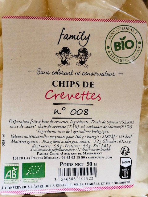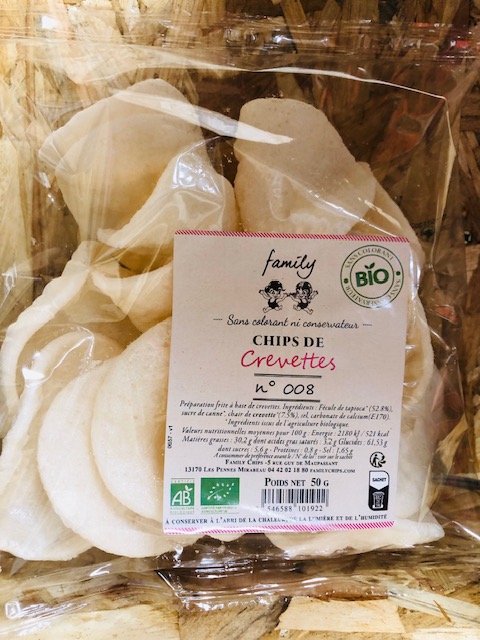 fécule de tapioca* (52,8%), sucre de canne*, chair de crevette* (7,5%), sel, carbonate de calcium (E170)
