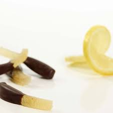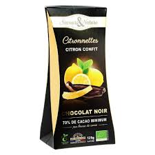 Lamelle de citron confit*: 75% (écorce de citron*, sirop de maïs*, sucre de canne brut*, jus de citron concentré*, farine de riz*); chocolat noir à 70% de cacao minimum*: 25% (pâte de cacao* et beurre de cacao* 74.5%, sucre de canne* 25.5%).