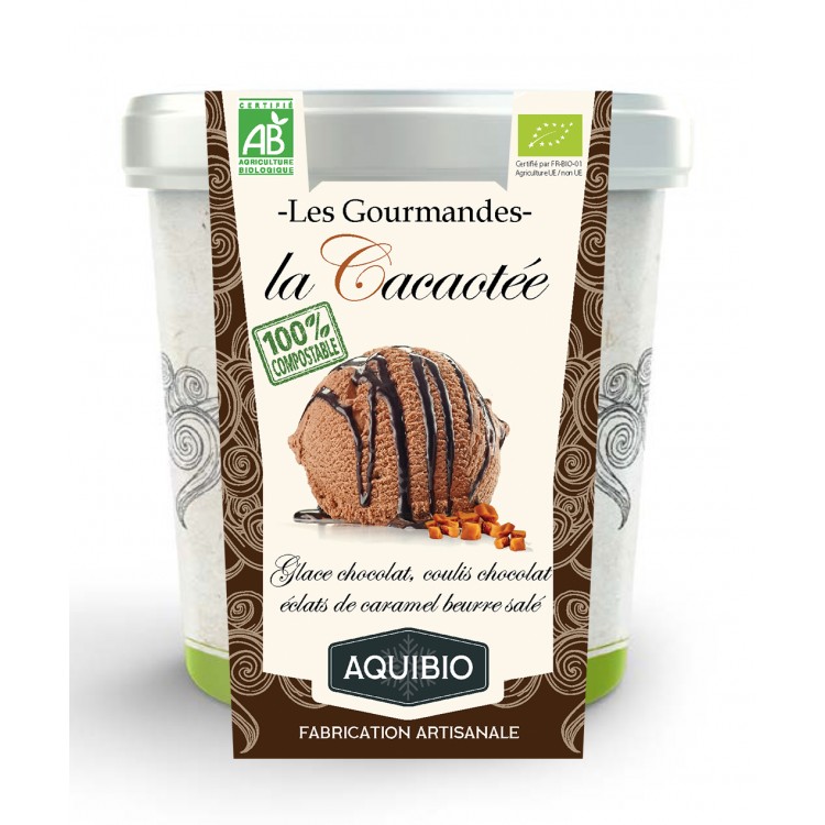 Crème glacée chocolat* (crème fraîche pasteurisée* (LAIT), sucre de canne non blanchi*, lait écrémé* (LAIT), poudre de cacao*, sirop de glucose de maïs*, stabilisants végétaux* (farine de caroube*, gomme de guar*)), sauce chocolat* (sirop d’Agave*, eau, cacao maigre en poudre* (8.0%), amidon de maïs*), éclats caramel beurre salé*(sucre de canne*, sirop de glucose*, lait concentré sucré* (lait en poudre 0% de matière grasse (LAIT), beurre*(LAIT), sucre*), beurre* (10%) (LAIT), sel de Guérande (0.3%)).