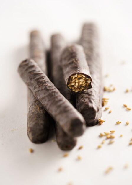 Graines de sésame* 65%, miel* 9%, chocolat noir d’Équateur*, glucose*, sucre de canne*, vanille* (produits issus de l’agriculture biologique).
