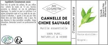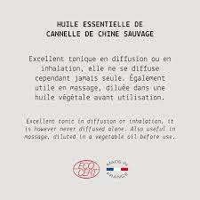 L’huile essentielle de cannelle de Chine est une huile essentielle puissante. Excellent tonique en diffusion ou en inhalation, elle ne se diffuse cependant jamais seule. Également utile en massage, elle se dilue fortement dans une huile végétale avant utilisation. Son odeur, typique de la cannelle, provient de sa composition riche en cinnamaldéhyde.