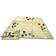 12 cartes, 20 billes en terre, livret de règles, une cour de récré en tissu