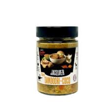 Fruit du jacquier* 30%, bouillon de légumes* (eau, carottes*, oignons*), lait de coco* 10%, courgettes*, huile de tournesol*, noix de coco* 3,5%, ail*, levure alimentaire*, sel, tandoori* 0,7%, épaississant : gomme de guar*, curcuma*, poivre noir*. *Ingrédients issus de l’agriculture biologique.