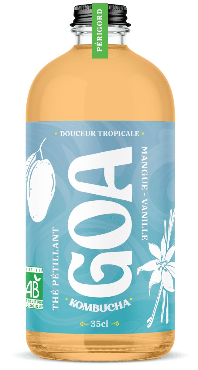 eau filtrée, culture de kombucha*, sucre de canne blond*, thé vert Sencha*, thé noir Darjeeling*, jus de mangue* (1.5%), extrait de vanille* (0.2%), jus de gingembre* (0.2%), arôme naturel de mangue*, fleur de souci*