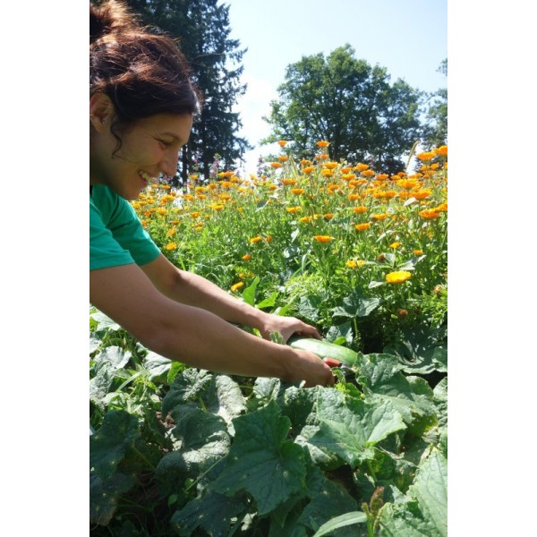 Carole notre herboriste cueille les concombres et procède à la fabrication du cosmétique à la suite de cette récolte, pour garantir l’utilisation de légumes frais. Nous obtenons un jus de concombres, qui devient l’actif phare du masque bio au concombre, fraîcheur.