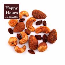 Arachides* (Egypte ou Chine), noix de cajou* (Vietnam), amandes* (Espagne), noisettes* (Turquie), graines de courge* (Pologne ou Chine), farine de pois chiche*, épices* poudre 1% : tomate*, paprika*, piment de Cayenne*, coriandre*, cumin*, citron*, fenugrec*, oignon*, sel, macis*, ail*, curcuma*, gingembre*, piment doux d’Espagne*, girofle*, cannelle*, laurier*.