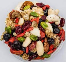 Amandes toastées*, noix de cajou*, noisettes*, canneberges* ( canneberges jus de pommes concentré*, huile de tournesol) baies de Goji, mûres blanches.