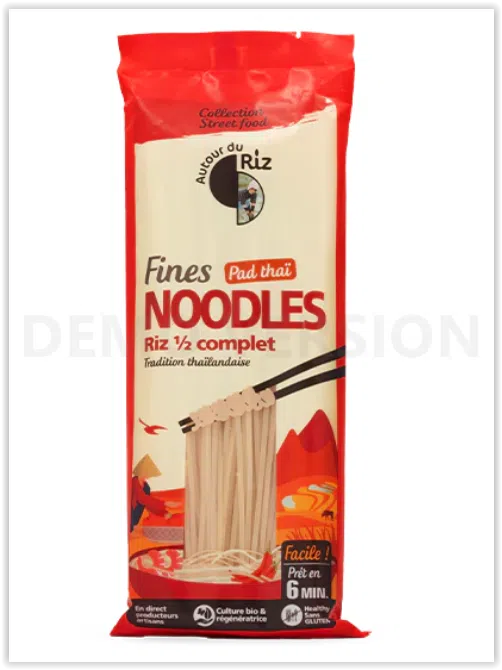 Pâtes alimentaires de riz semi-complet : 100% riz semi-complet de terroir Thaïlandais issu de l’agriculture biologique.