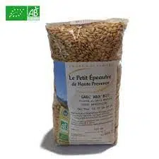 Ingrédients : Petit épeautre de Haute Provence* mondé (légèrement poli) (engrain-triticum monococcum). Mode de culture traditionnel.