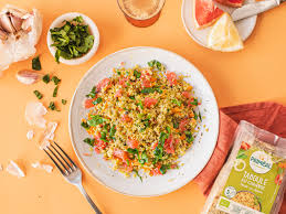Verser 1 vol. de taboulé dans un saladier, ajouter 1 vol. d’eau bouillante, couvrir, laisser gonfler 5 min,